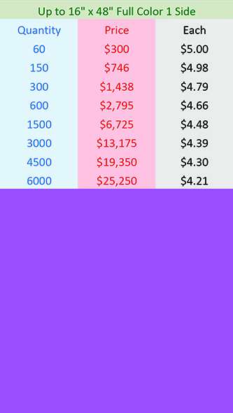 We show only the most efficient sizes for 48x96" and 60x120" master sheets. Any size is available. We also show number of signs at a price break number of full sheets (10 full sheets, 25 full sheets, 50 full sheets, ...).